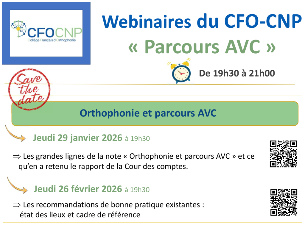 Le College Français d’Orthophonie (CFO) est le Conseil National Professionnel des orthophonistes (CNP). Le CFO-CNP répond aux sollicitations des différentes instances notamment la Haute Autorité de Santé pour des expertises cliniques et scientifiques de la profession.  A la demande de la Cour des comptes, le CFO-CNP a rédigé, en mars 2025, une note concernant l’intervention orthophonique au fil des quatre phases qui composent le parcours post accident vasculaire cérébral (AVC) sur tout le territoire français. Cette note se veut descriptive et propose dans le même temps une analyse des forces, des faiblesses et des menaces de cette intervention orthophonique multi-scalaire. Enfin, elle met en lumière des aspirations et des opportunités dans l’objectif d’améliorer l’offre de soin.  La Cour des comptes a rendu son rapport sur la prise en charge des AVC en octobre 2025. C’est dans ce contexte que le CFO-CNP propose un cycle de quatre webinaires en 2026 à destination des orthophonistes.  Les deux premiers webinaires, respectivement de janvier et de février 2026, s’attèlent à présenter la note produite par le CFO-CNP, le rapport de la Cour des comptes et les recommandations de bonne pratique en vigueur.  Les deux derniers webinaires offrent un espace d’échange en laissant la parole aux orthophonistes. Le CFO-CNP propose aux orthophonistes du territoire de partager leurs expériences d’interventions innovantes dans le cadre du parcours AVC lors des webinaires du 26 mars et du 23 avril 2026.